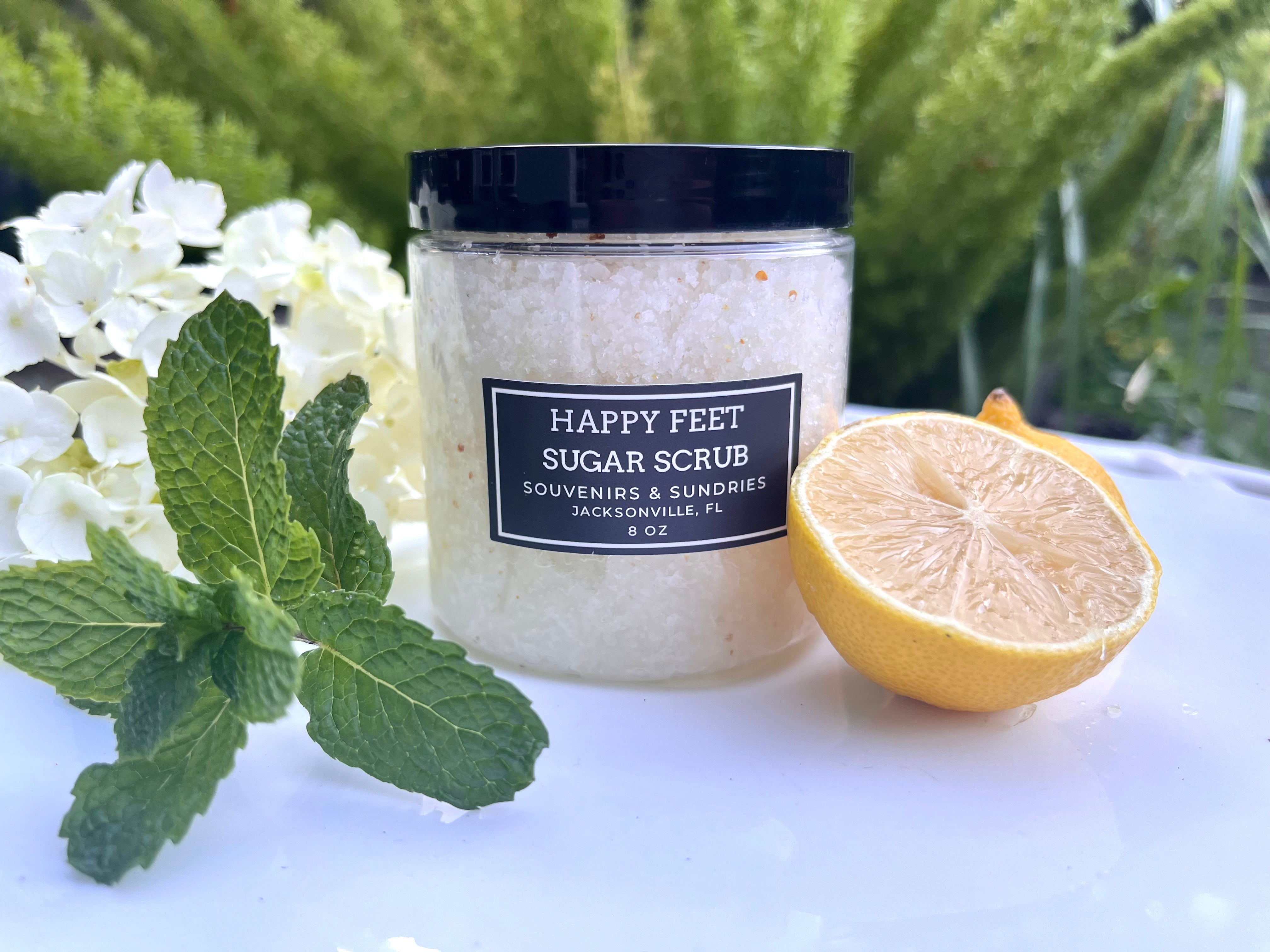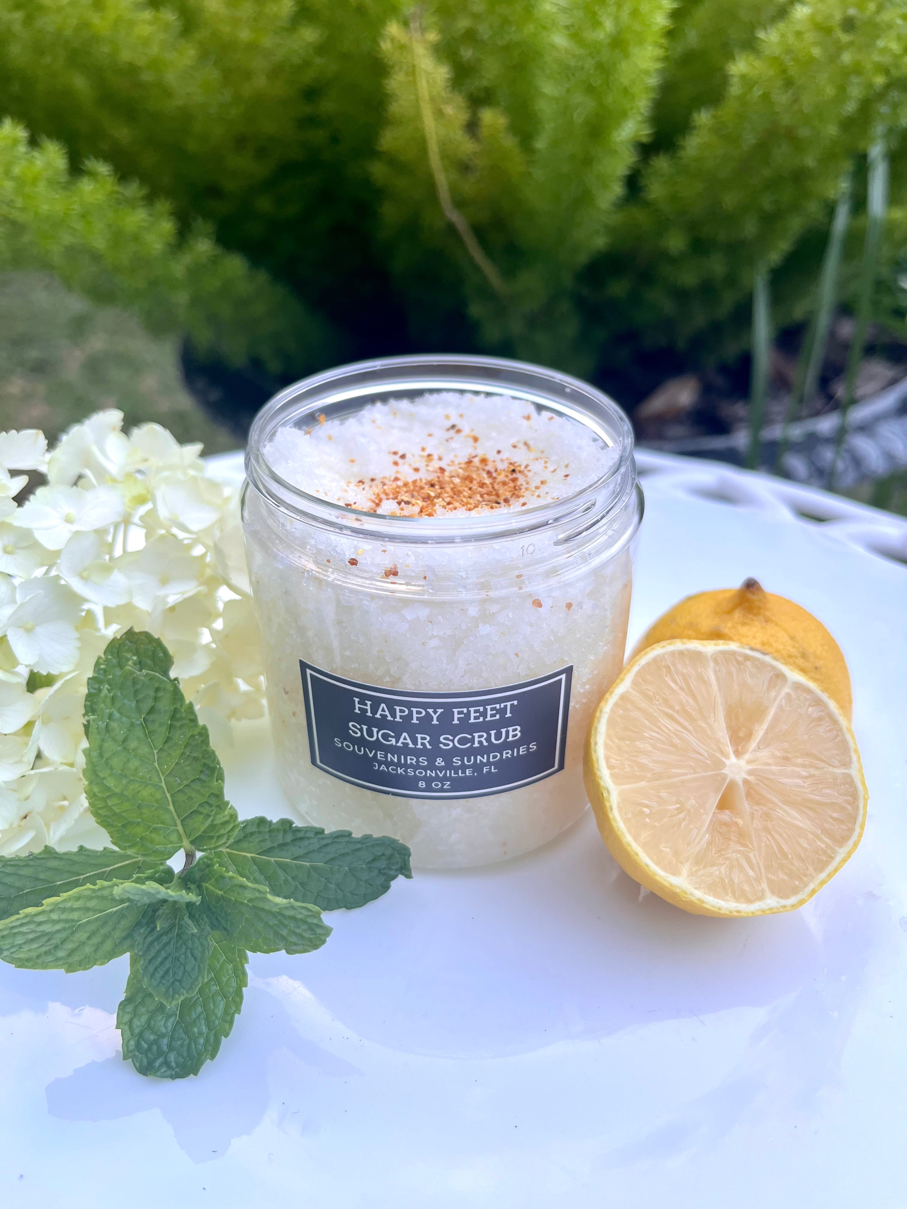 The 8 oz Happy Feet Sugar Scrub is Lemon and Peppermint and has Sea Salt mixed in for a more abrasive scrub which is great for your tired feet and the oils gives relief to dry and cracked heels.